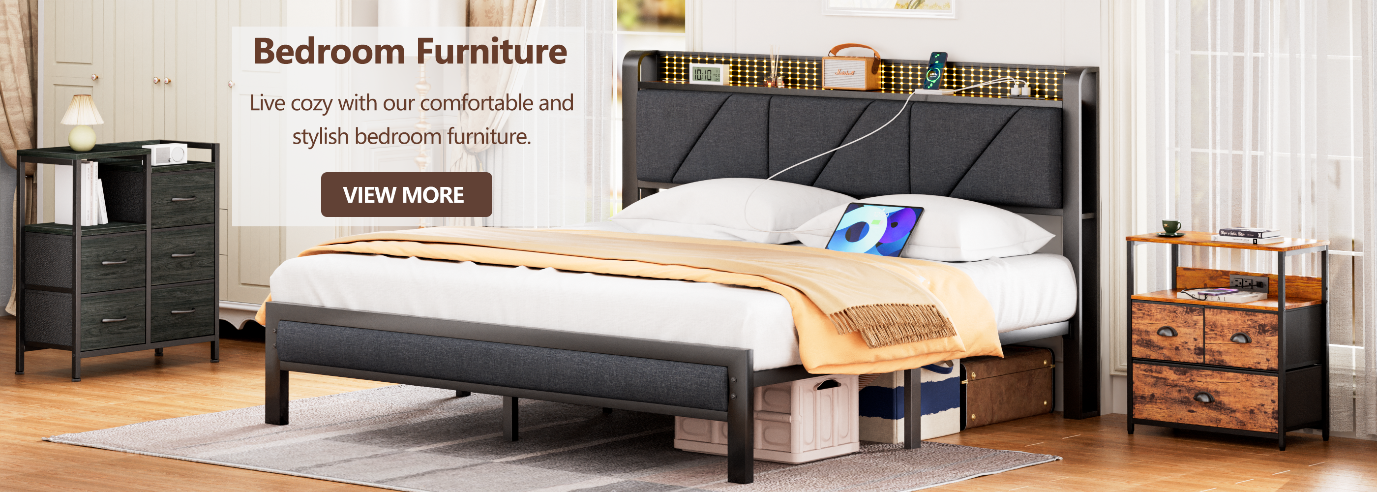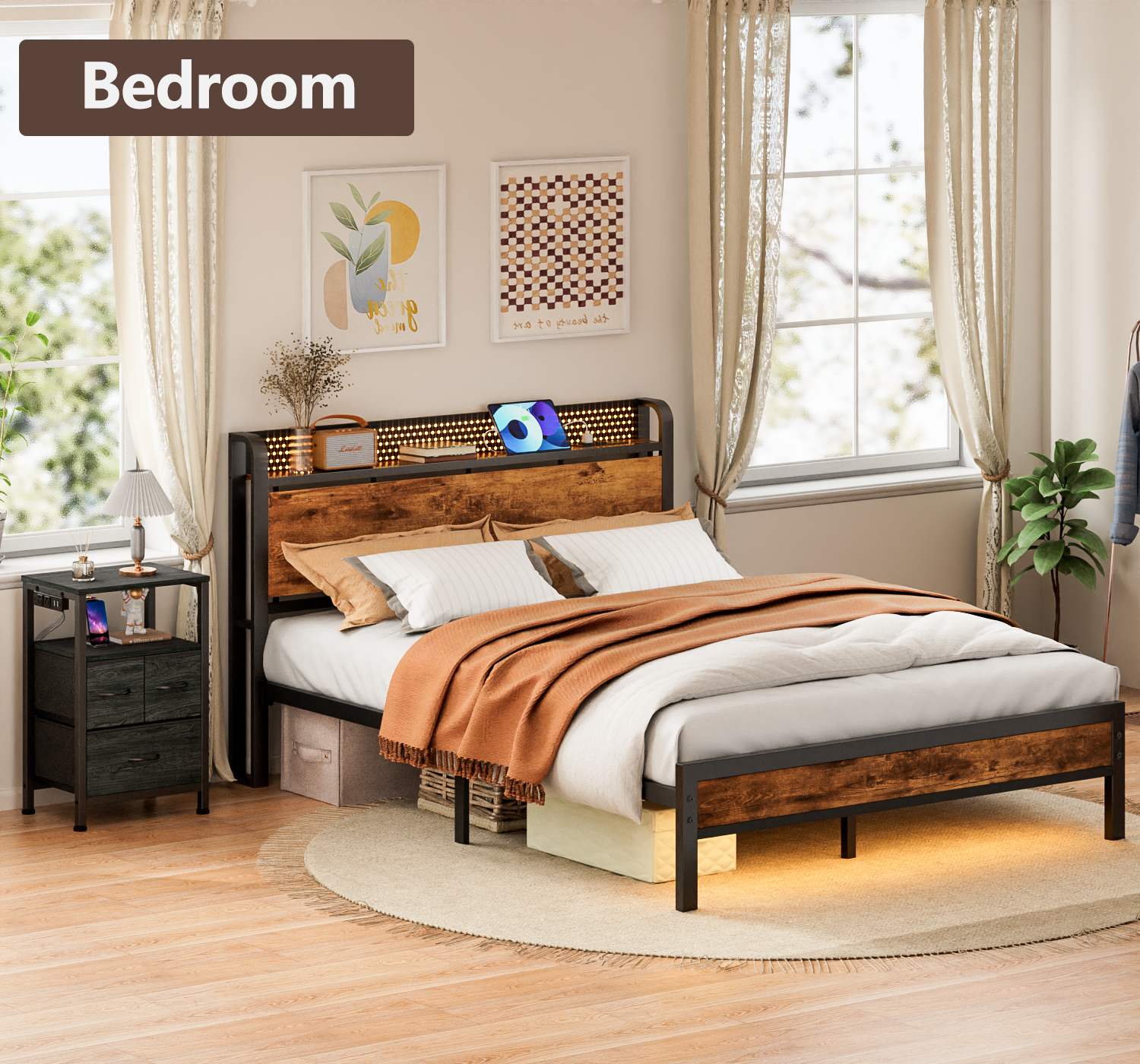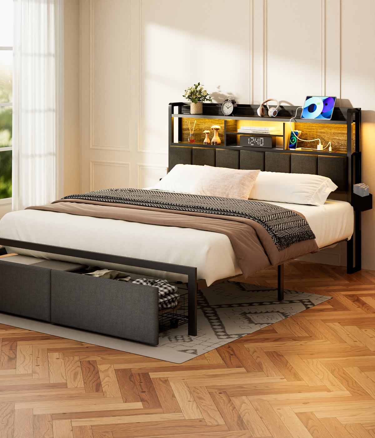 Furnulem LED Bed Frame with Upholstered Headboard and Charging Station