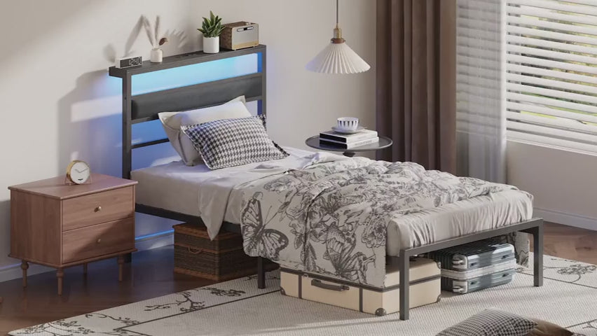Full Bed Frame with LED Lights, Headboard with Charging Station Upholstered Platform Bedframe Metal Support No Box Spring Needed 2-Tier Storage