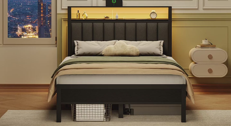 Full Bed Frame with Upholstered Storage Headboard, Metal Platform Bed Station with Charging Station & LED, Noise-Free. No Box Spring Needed
