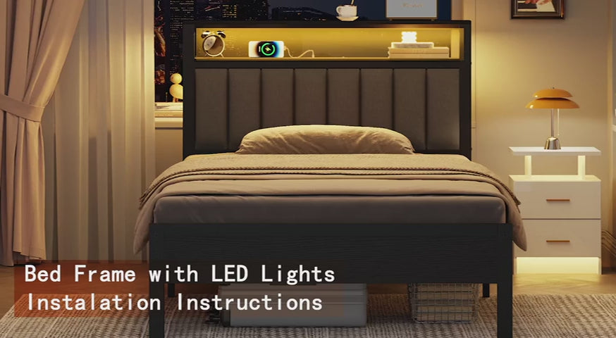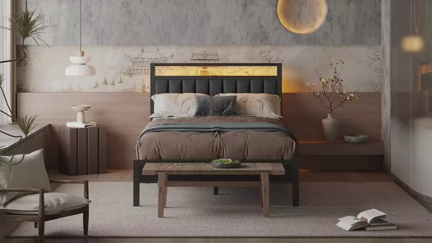 Full Bed Frame with LED Lights, Headboard with Charging Station Upholstered Platform Bedframe Metal Support No Box Spring Needed 2-Tier Storage