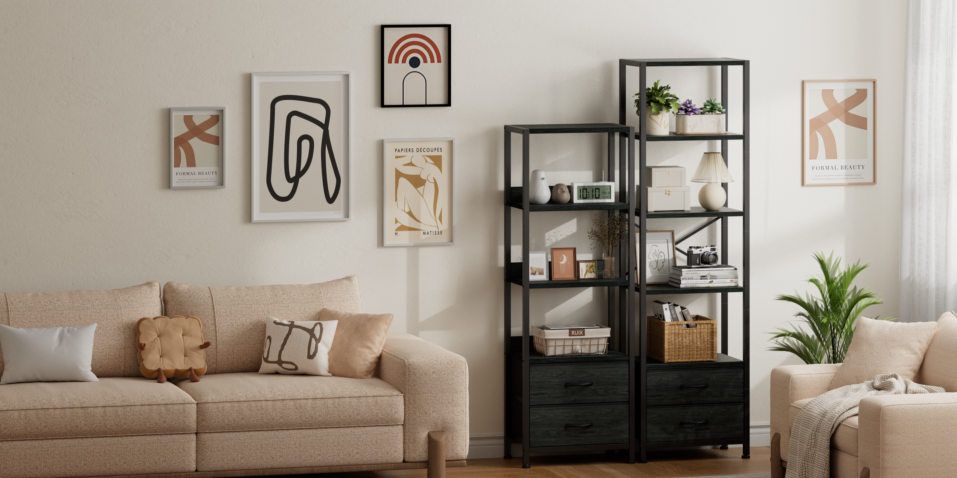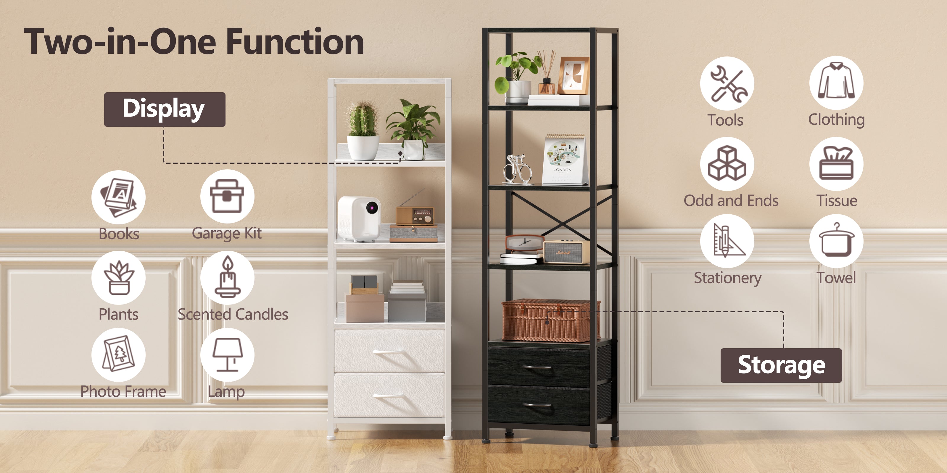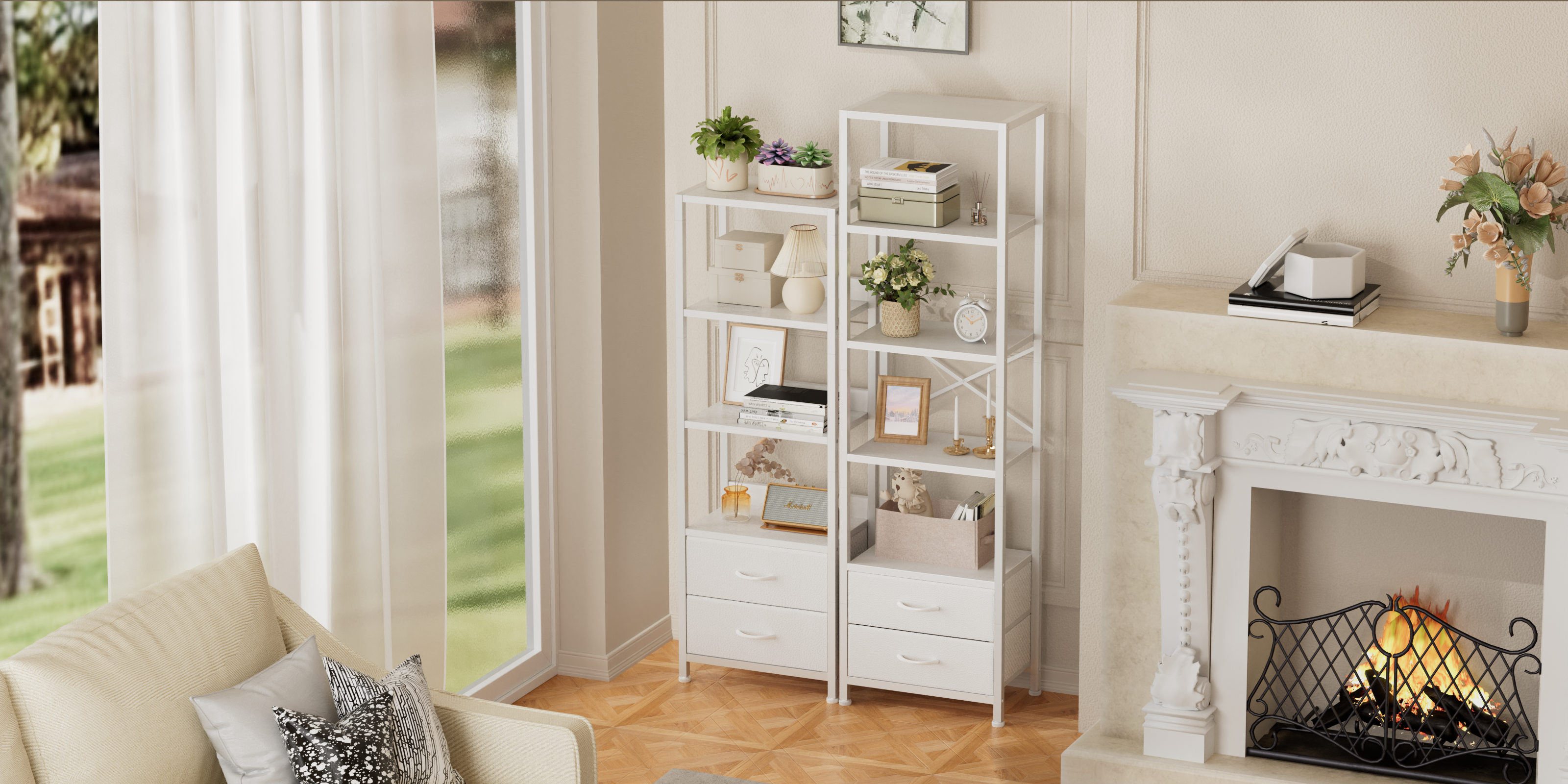 The open display corner shelf features a 4/5 tier open shelves and 2 drawers design, providing large capacity and space-saving features. The storage rack includes a back panel to prevent items from sliding off.