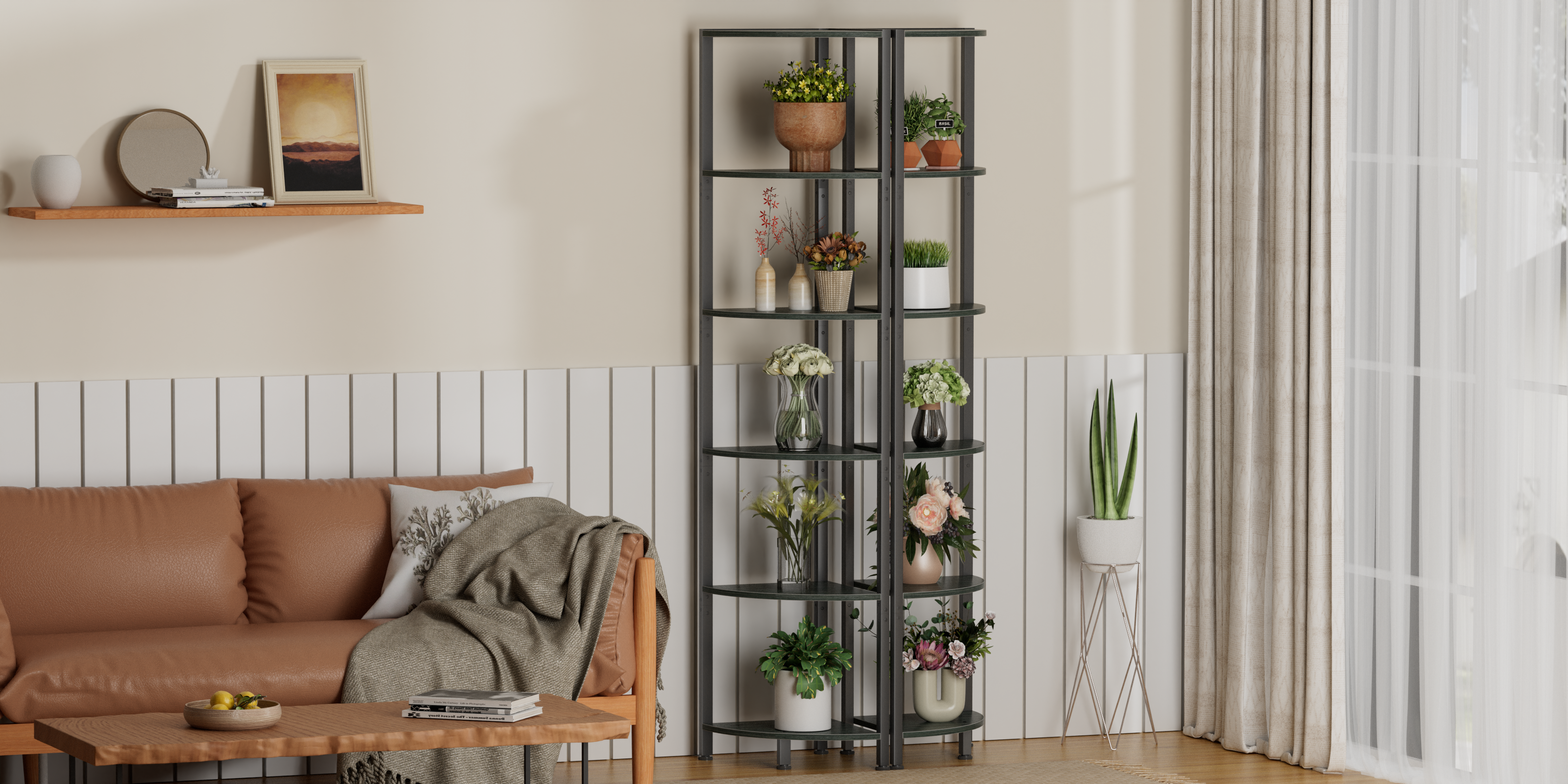 This 5/6 tier Corner Shelf is perfect for organizing and displaying books, photos, and other items in a small space. The open shelf structure will add visual volume to your small apartment and is the perfect storage option for any space.