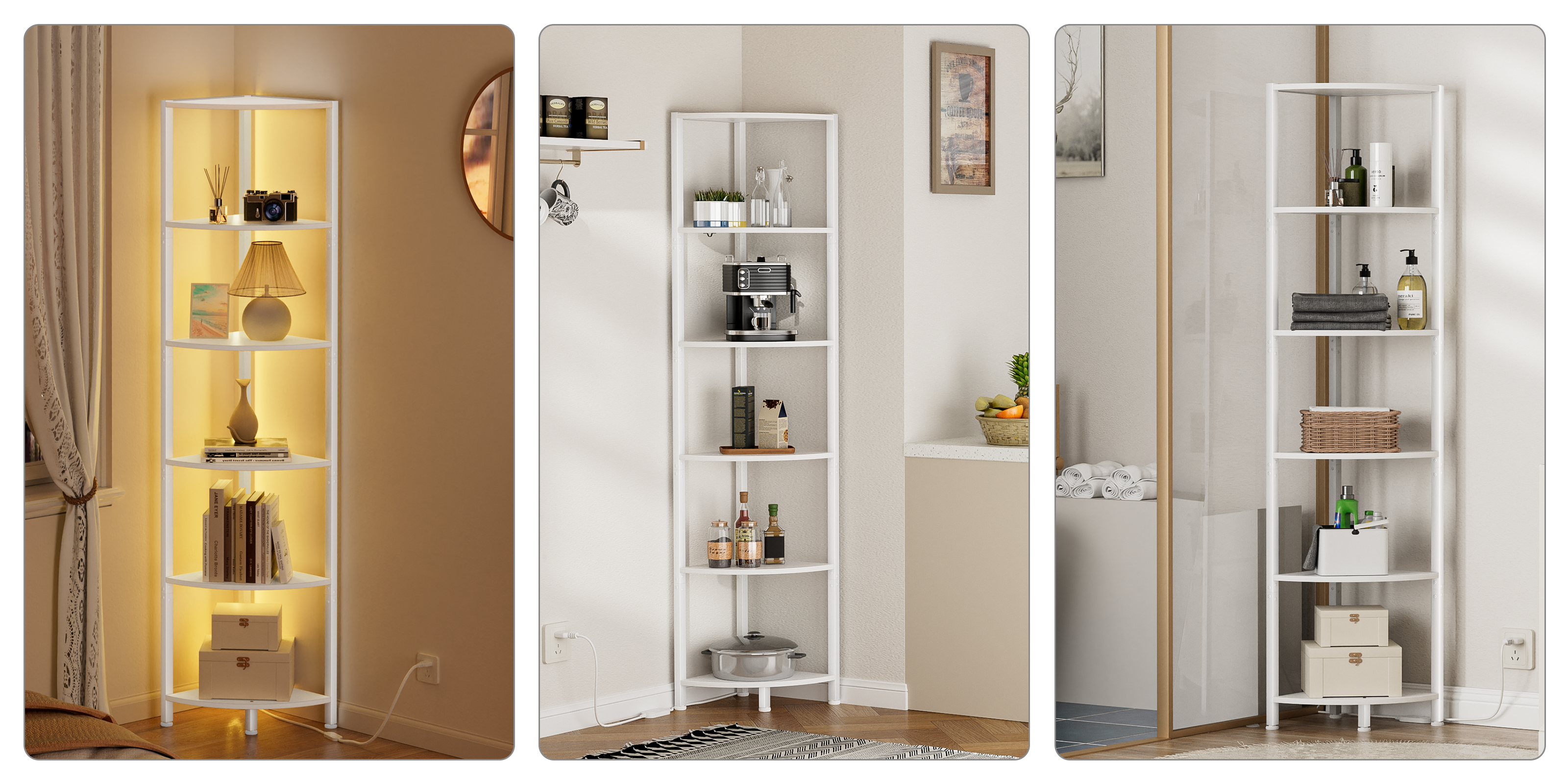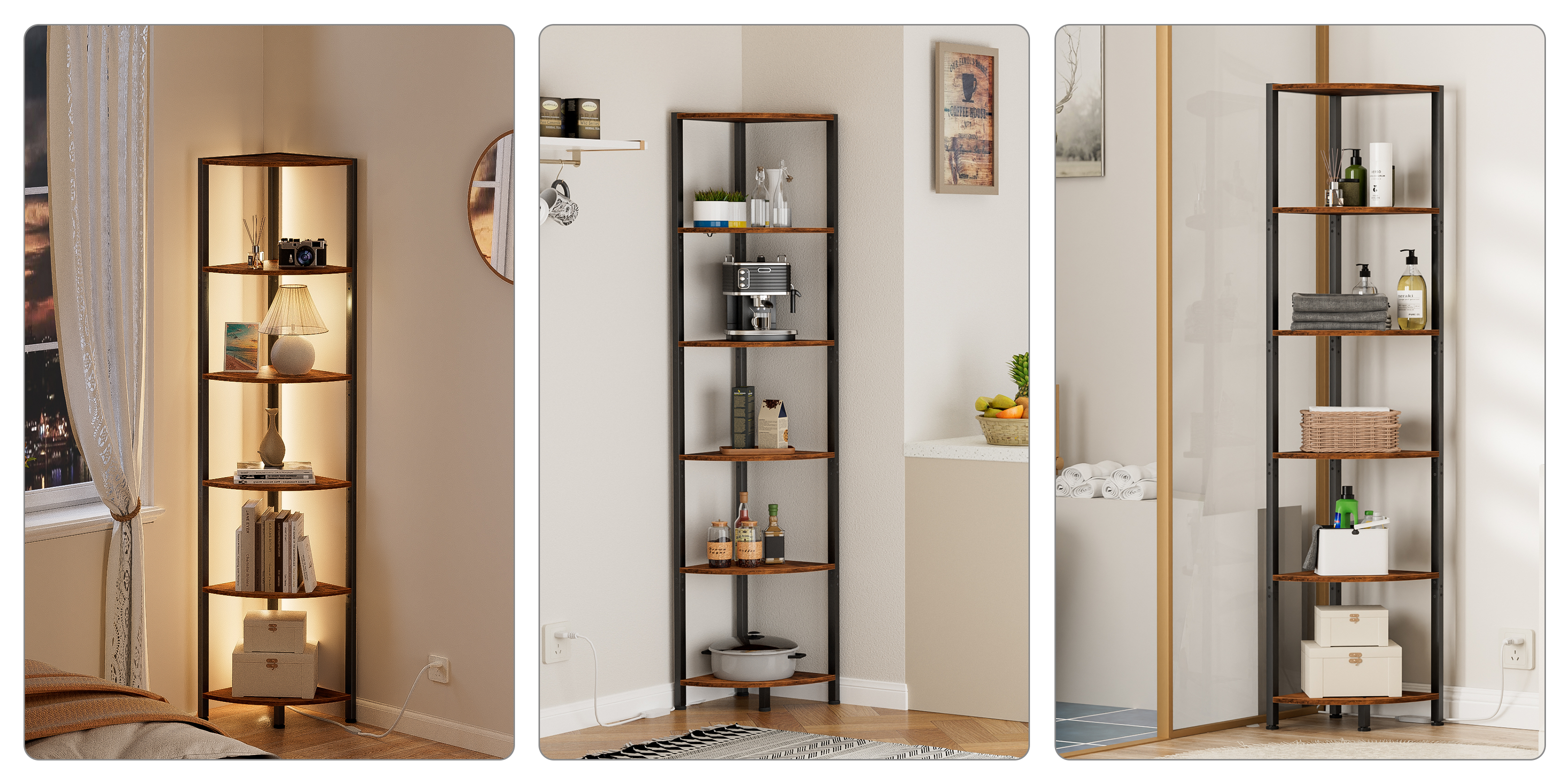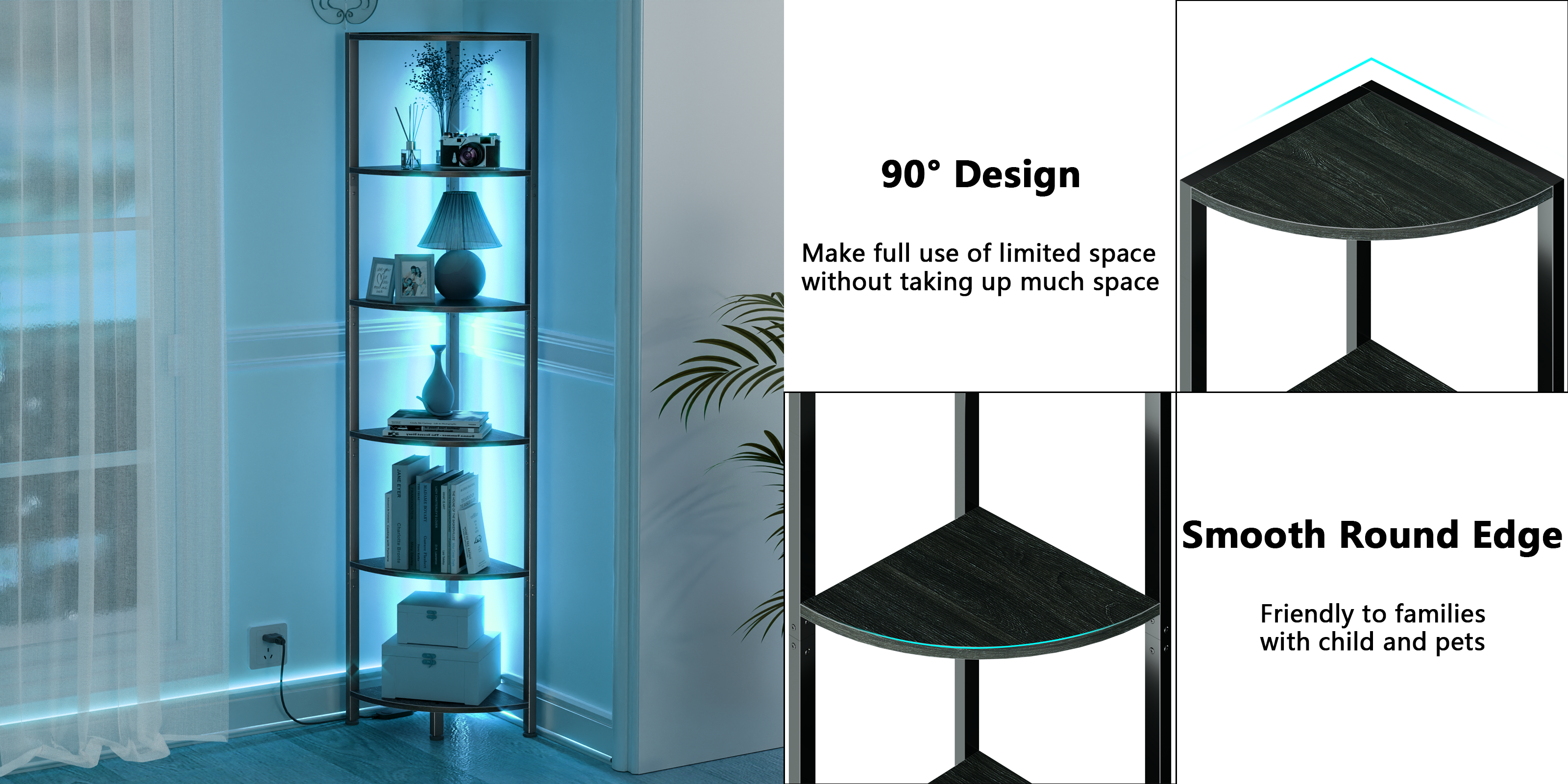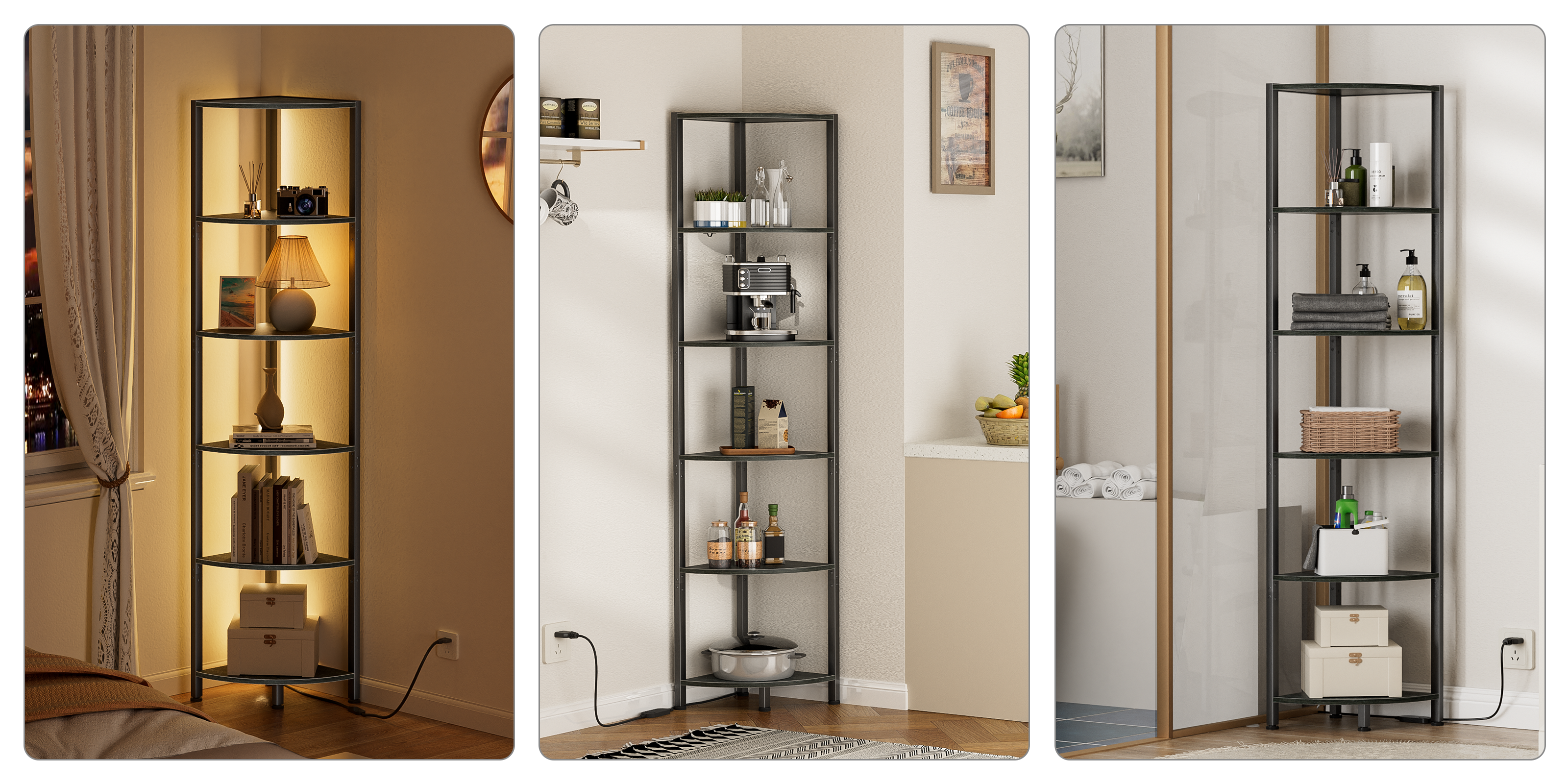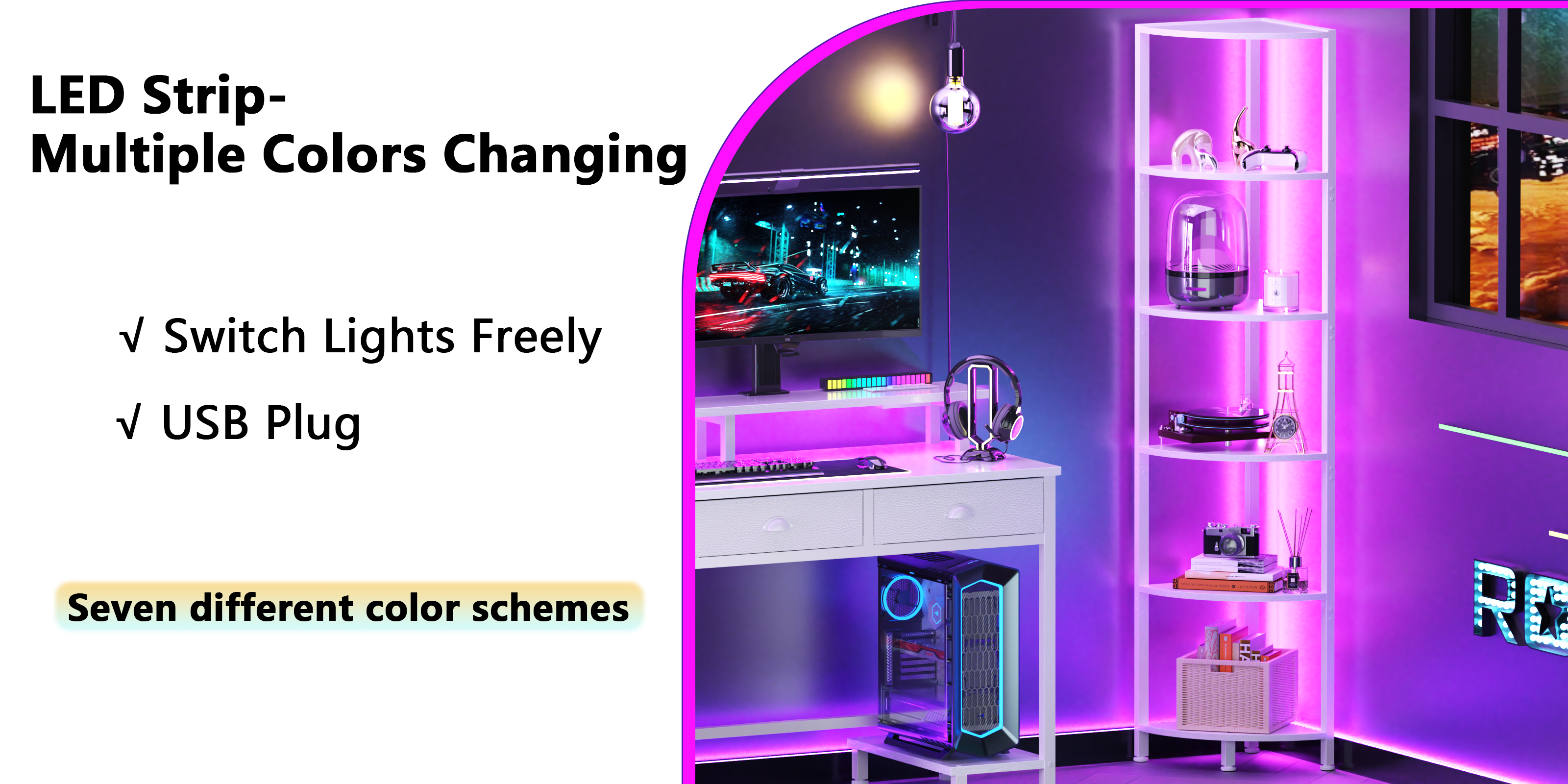 This corner shelf has been specially equipped with LED light strips, with multiple colors available for adjustment, easily lighting up your night.