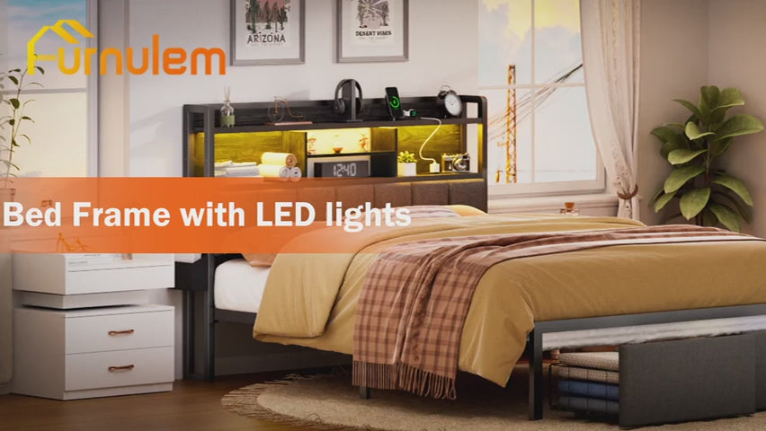 Furnulem Queen Bed Frame with Storage Drawers Upholstered Headboard with Storage Shelf LED Lights and Charging Station Metal Platform Bed Frame